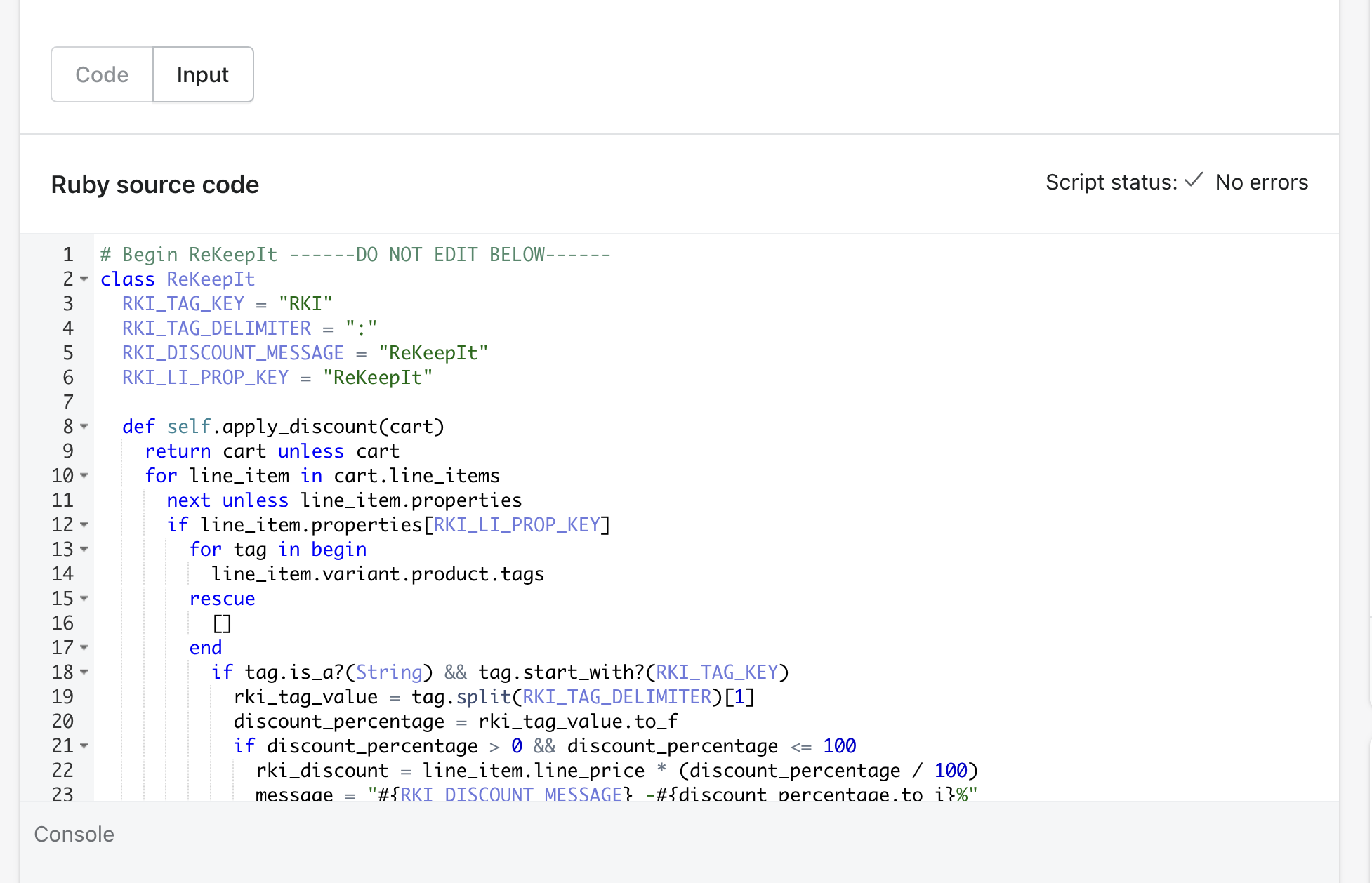 ReKeepIt uses Script Editor to apply the appropriate discounts to your customers' line items without interfering with other discounts. Currently, Script Editor is only available to Shopify Plus merchants.