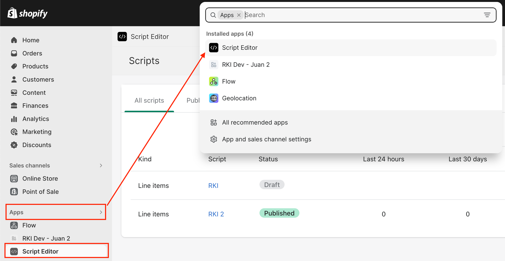 Navigate to the Script Editor in your Shopify Admin sidebar or find it in your Apps searchbar