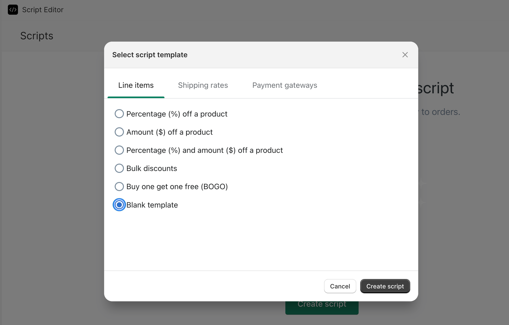 - Create a script - make sure that it is a Line Item script and Blank Template